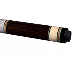 This Southwest Model SW30922 features a highly figured Birdseye Maple forearm with six Palisander points that alternate in their heights and feature white, green, and black laminates. Every single part of those six inlays and laminates are topped with a cactus needle sharp point. The sleeve has a beautiful piece of Palisander with thin white, green, and brown rings over a smaller Birdseye piece that matches the points layout from the forearm. No expense is spared with the five sets of rings (A, B, C, D, and E locations) include one matching set on both of the two 13mm shafts that it comes with. A brown and white linen grip compliments the palisander points and dashed rings. This cue has the custom 3/8 x 11 pin stamped with a cactus and the 309 22 identification, weighs 19.3oz and is 58″ in length.